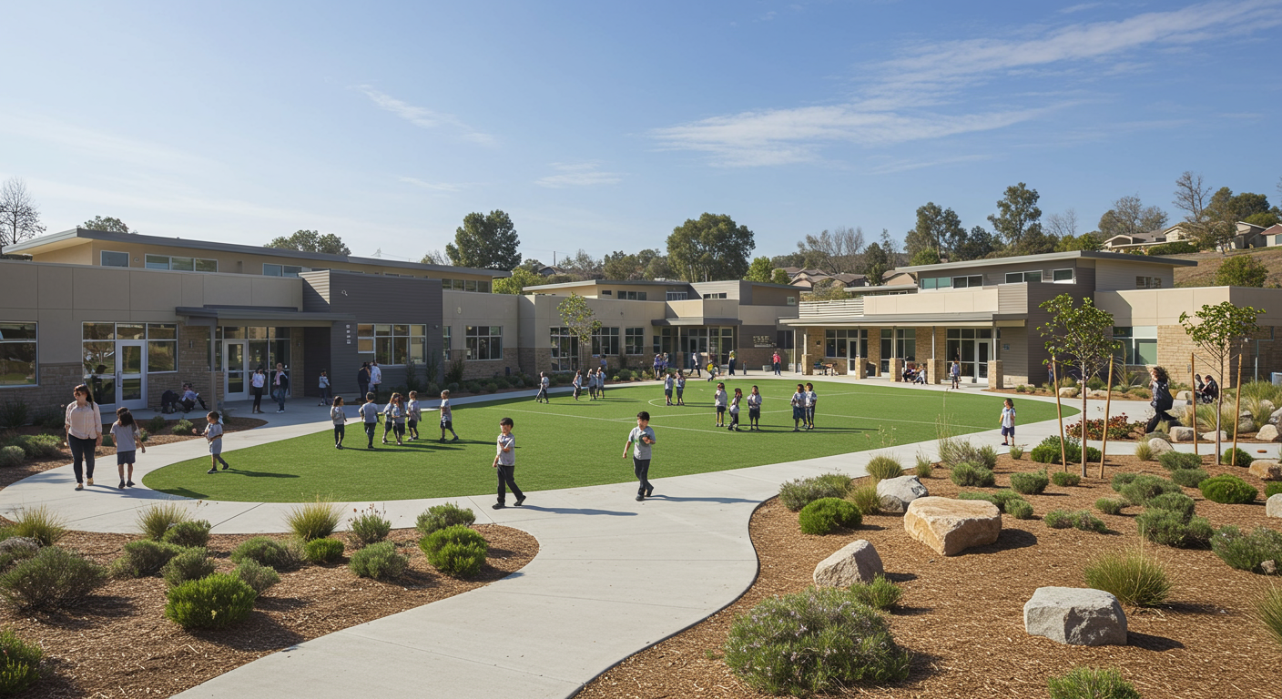 The school is designed by Quattrocchi Kwok Architects (QKA) and includes two-story classroom buildings, a multipurpose building, a library, and administration and after-school childcare spaces. Design features include strategic building positioning and operable windows to allow for natural ventilation in all classrooms, energy efficient lighting and mechanical systems, drought tolerant landscaping and recycled water for irrigation.
