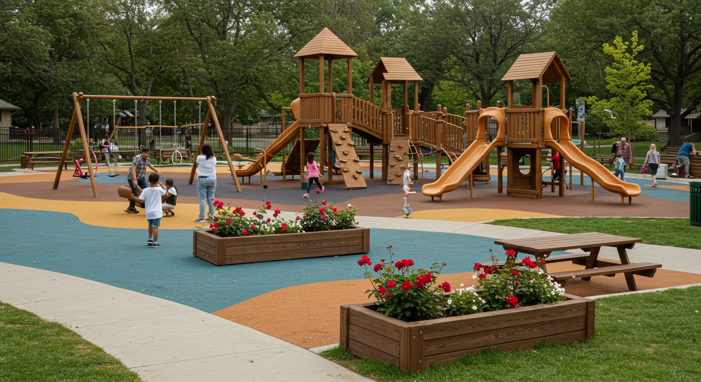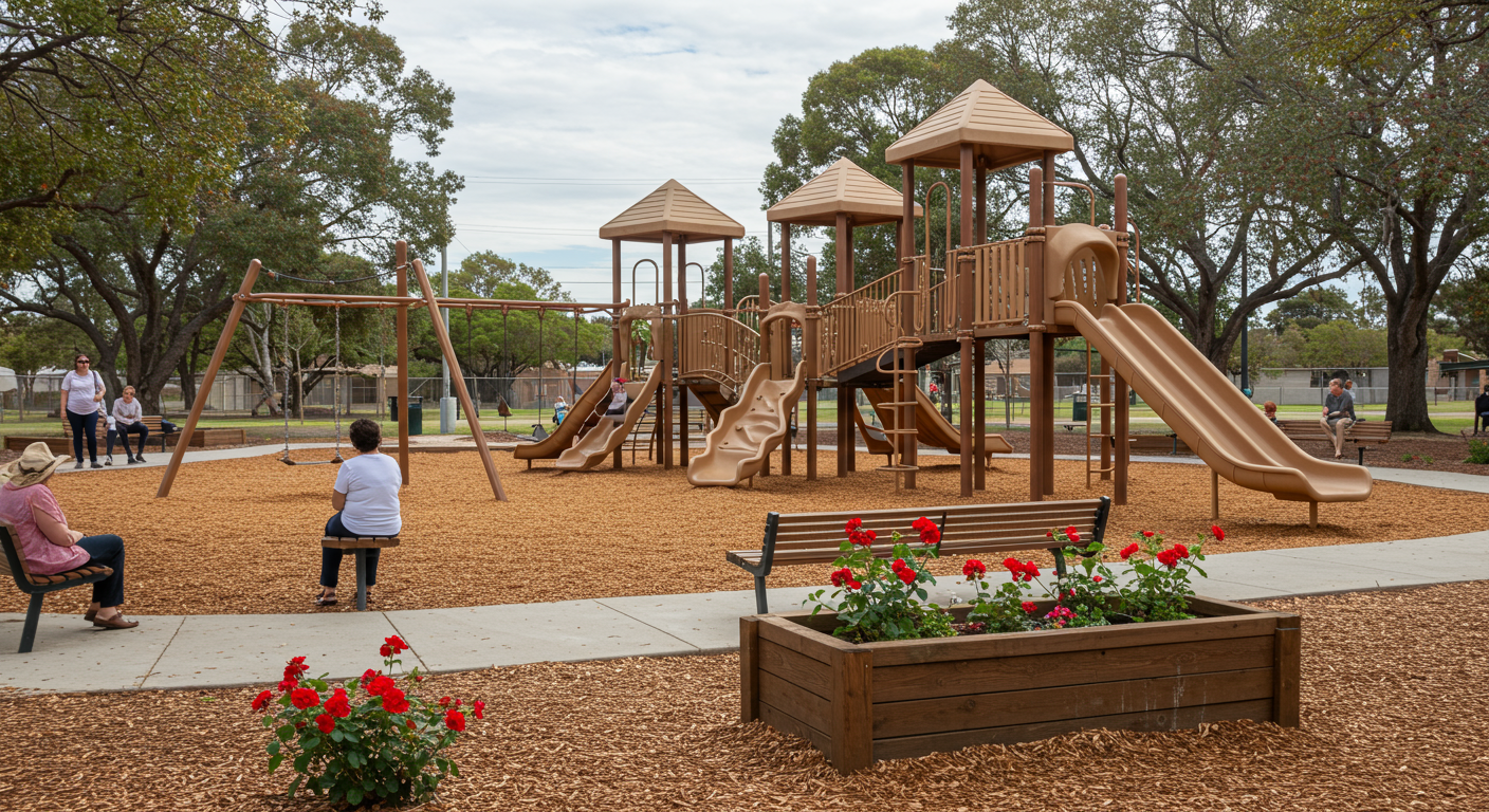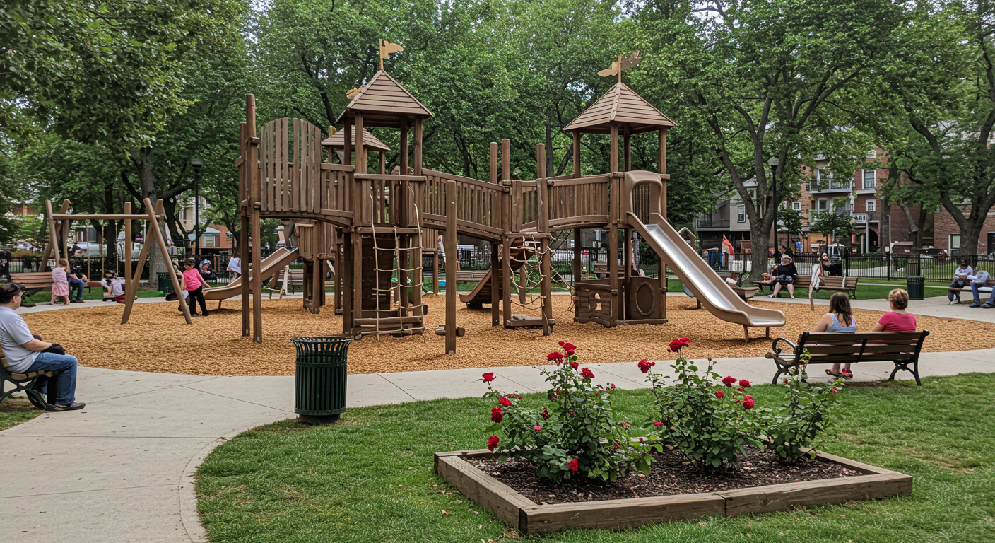 The play area was closed off to the public in early 2016 for the project. During the renovation, existing structures in both the play and picnic areas were taken down and replaced with new high-quality structures. The ‘Old West’ themed playground features play areas for different age groups, as well as new safety surfacing throughout the area. Parents will be able to sit on decorative planter benches to watch their little ones, or enjoy a picnic lunch at one of the many nearby tables. Additionally, the decorative rose boxes have been renovated and made more disabled accessible.