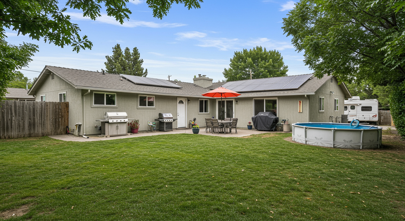 Single story, updated rancher with versatile, open floor plan and views! Recently painted interior and exterior, remodeled in 2000. Large Chef's kitchen with granite countertops, large island, gas stovetop, double ovens and beautiful cabinetry. Enjoy outdoor living with built-in BBQ, pool with solar heat and a patio perfect for dining alfresco. RV parking is a plus! |