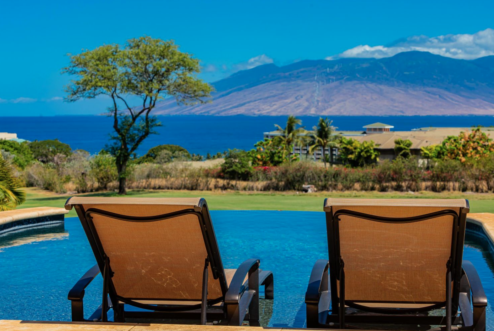 "The Rock of Wailea" is a structurally sound and stunning Wailea Golf Vistas fully furnished 4 bedroom, 5.5 bath single level smart home consisting of 5756 square foot interior living area featuring unobstructed ocean views situated on the Wailea Blue 16th green with unique construction qualities and back up generator system with 2 propane tanks; sitting directly on blue rock with substantial concrete, steel studs and bunker! The amazing finish details include 9'6" bamboo paneled ceilings, all handmade mahogany trim, baseboards and ceilings. Additional amenities include advanced Lutron lighting and control system, Brazilian hardwood floors, 24x24 European travertine tiles, silk draperies, automatic window coverings, automatic shades, mahogany wood shutters, automatic nightlights, triple edge granite kitchen countertops, 31 owned PV solar panels on concrete tile roofing plus 4 hot-water solar panels. |