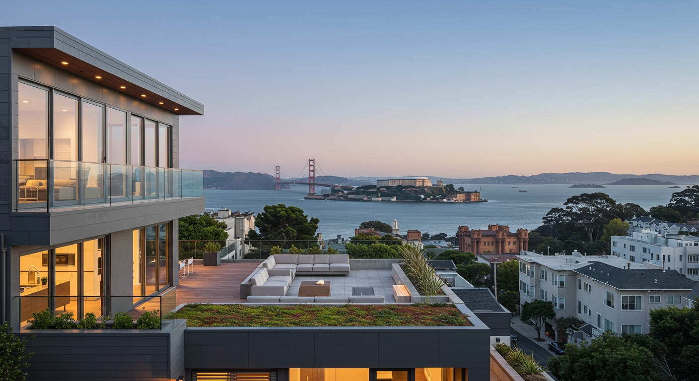 Breathtaking views! Unapologetically modern design by Edmonds + Lee architects. 2833 Vallejo is an elegant, tech savvy home with views of the Golden Gate Bridge, Palace of Fine Arts and Alcatraz on one of San Francisco's most desirable blocks. Refined material palette includes Belgian Ash paneling, wide-plank white oak floors, custom Boffi cabinetry, Carrera marble and Arakawa art hanging system. Simplify Home Technology for 21st Century living. The rooftop deck crowns 2833 Vallejo with amazing views of San Francisco's iconic landmarks. Usable living green roof over the 4 car garage plus 2 private patios plus an elevator. There is also a recreation/gym, media room, and temperature control wine room.